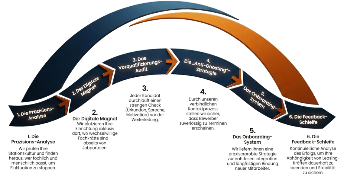 Unser praxiserprobtes System aus 6 entscheidenden Hebeln, mit dem wir es geschafft haben Fachkräfte langfristig erfolgreich in Festanstellungen zu vermitteln Pflegestationen dauerhaft zu besetzen und unseren Partner-Einrichtungen über etliche tausend Euro an Leasingkosten einzusparen. Dieses fertige Erfolgssystem setzen wir ab sofort exklusiv für Ihre Einrichtung ein, um den Fachkräftemangel für Sie endgültig zu lösen.